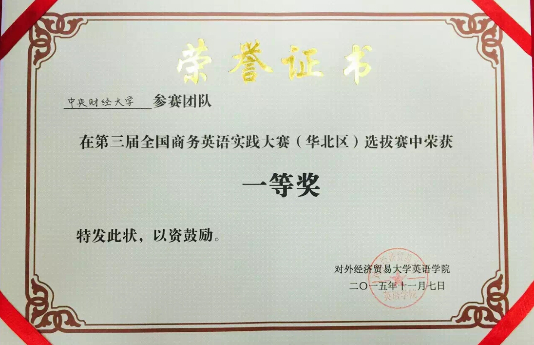 11月7号下午,第三届全国商务英语实践大赛(华北区)选拔赛在对外经济贸易大学如期举办。经过参赛队员们长达两三周的调研、讨论、练习,在公司李勤习、郭娟、张润晗、傅强、陈雨松、肖凤娟、闫书颖、孙瑾等八位老师的认真指导下,公司代表队最终以出色的表现脱颖而出,荣获华北赛区选拔赛一等奖(一等奖只有1个),凯旋而归。