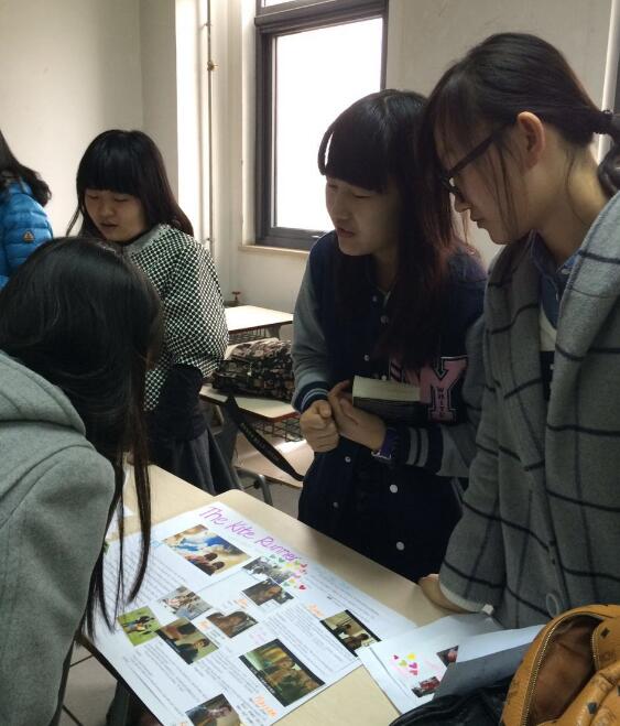 现场同学们有的通过制作精美的海报来展示自己读到的好书内容和个人感受,有的则是用PPT的形式,图文并茂的呈现自己的读书心得。前50分钟由英语班的员工“支摊儿”,“推销”自己读过的一本书。翻译系的员工在各个“摊位”上和“推销员”进行一对一的交流,他们把自己感兴趣的书名也认真的记在了小本上,“推销员”也会非常耐心地回答每一个问题。翻译系的员工就像在逛书市一样,在不同的“摊位”停留时间也不一样。他们手里拿着一些老师分发的贴纸,遇到特别喜欢的“推销员”,就会把一个“小桃心”贴在对方的海报或是电脑上,以示鼓励。后50分钟,两个班角色调换,英语系的员工开始在教室里逡巡,寻找自己感兴趣的书籍。