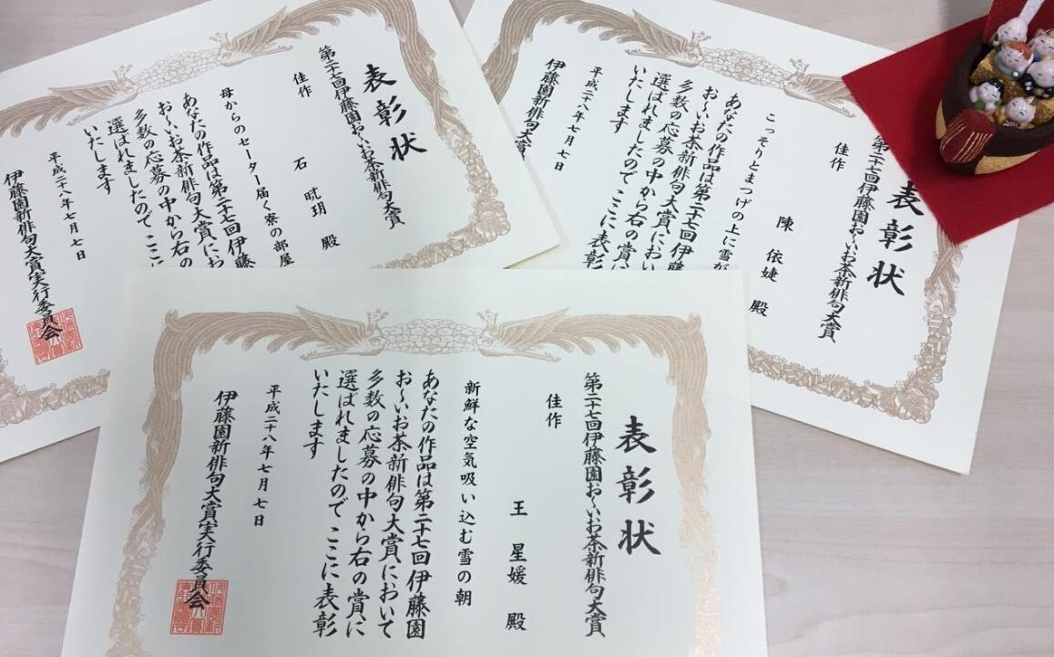 在近期揭晓的日本伊藤园新俳句大赛中,公司日语系员工王星媛、陈依婕、石晓玥同学在全世界54个国家、186万篇作品中脱颖而出,荣获佳作奖,为公司争得了荣誉。