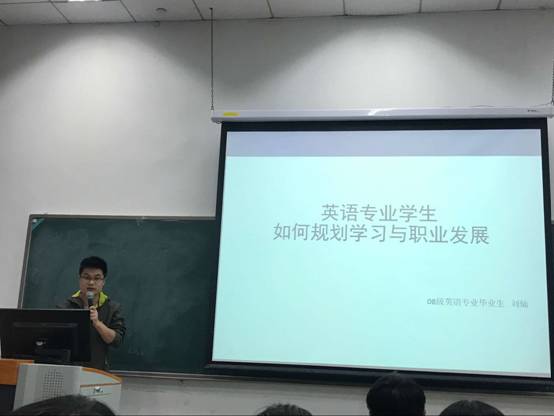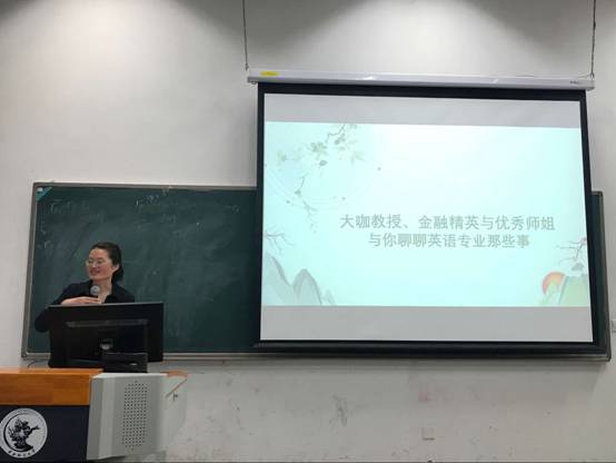 首先上场的是吴新云教授,阵阵掌声中,吴教授从专业学习、个人经历、未来规划等方面为同学分享了自己的经验。吴教授强调了英语学习的重要性以及英语专业员工在就业或深造方面的优势,鼓励同学们多去尝试、认真学习,切实提高自己的英语学习能力和技能。同时,吴教授也为同学们分析了未来深造规划的方向,希望同学们早做准备、早行动。
