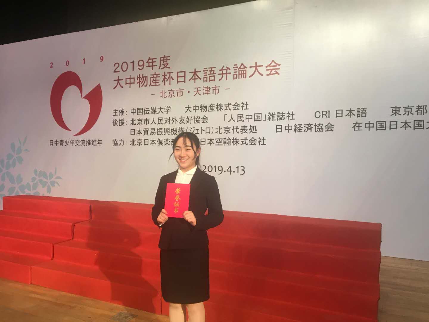 4月13号,2019年度大中物产杯日语演讲大赛在中国传媒大学圆满落幕。Playace平台官网入口日语系18级林婧同学发挥出色,获得初级赛第三名的好成绩,日语系李蕊老师带队部分员工前往观摩比赛,并全程进行了指导。