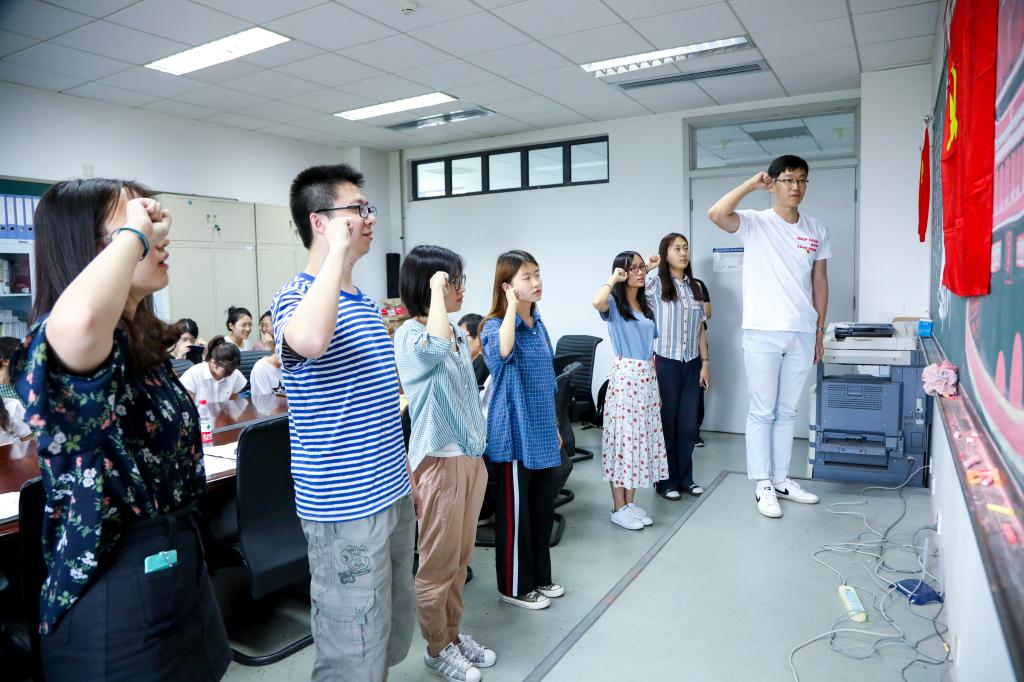 活动一开始,范维副书记和徐芳书记为新发展的七名预备党员佩戴党员徽章,并见证了他们在党旗下进行庄重的入党宣誓。